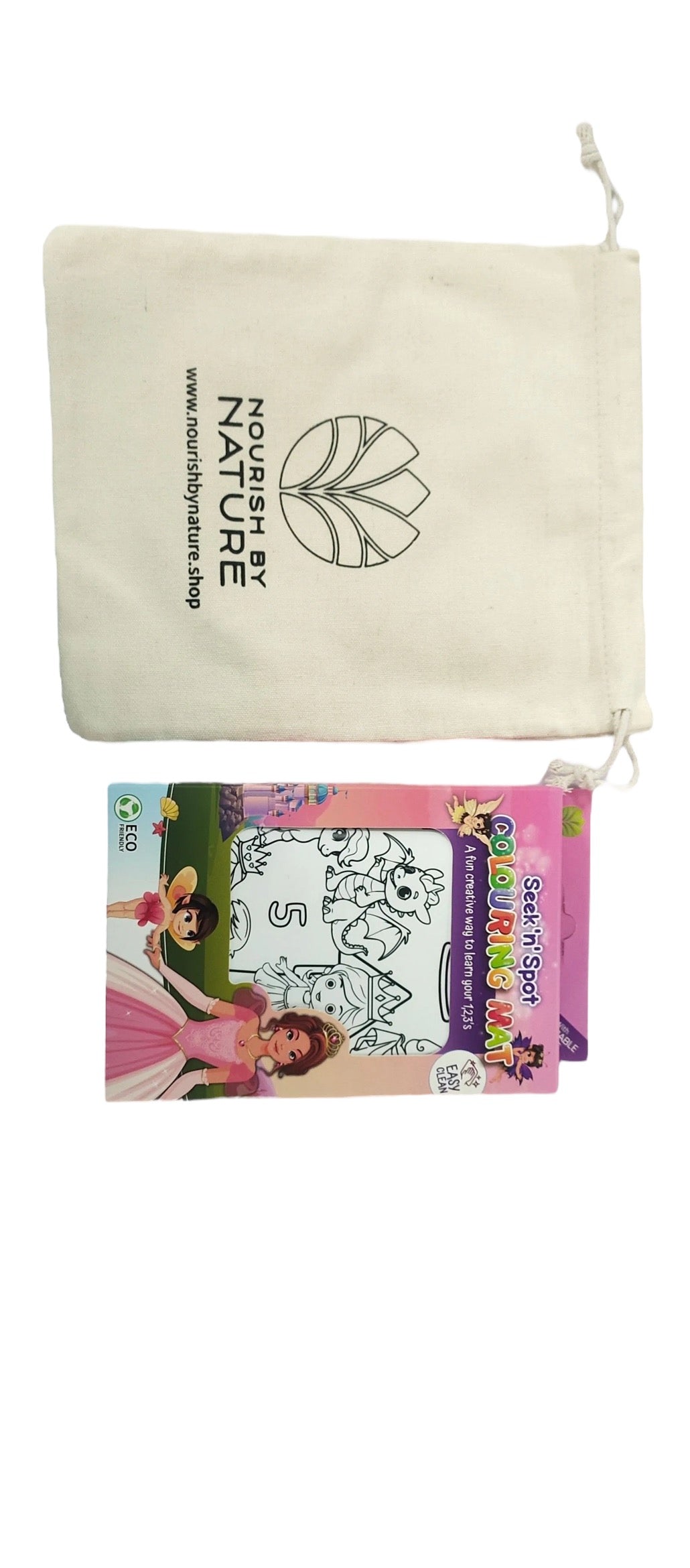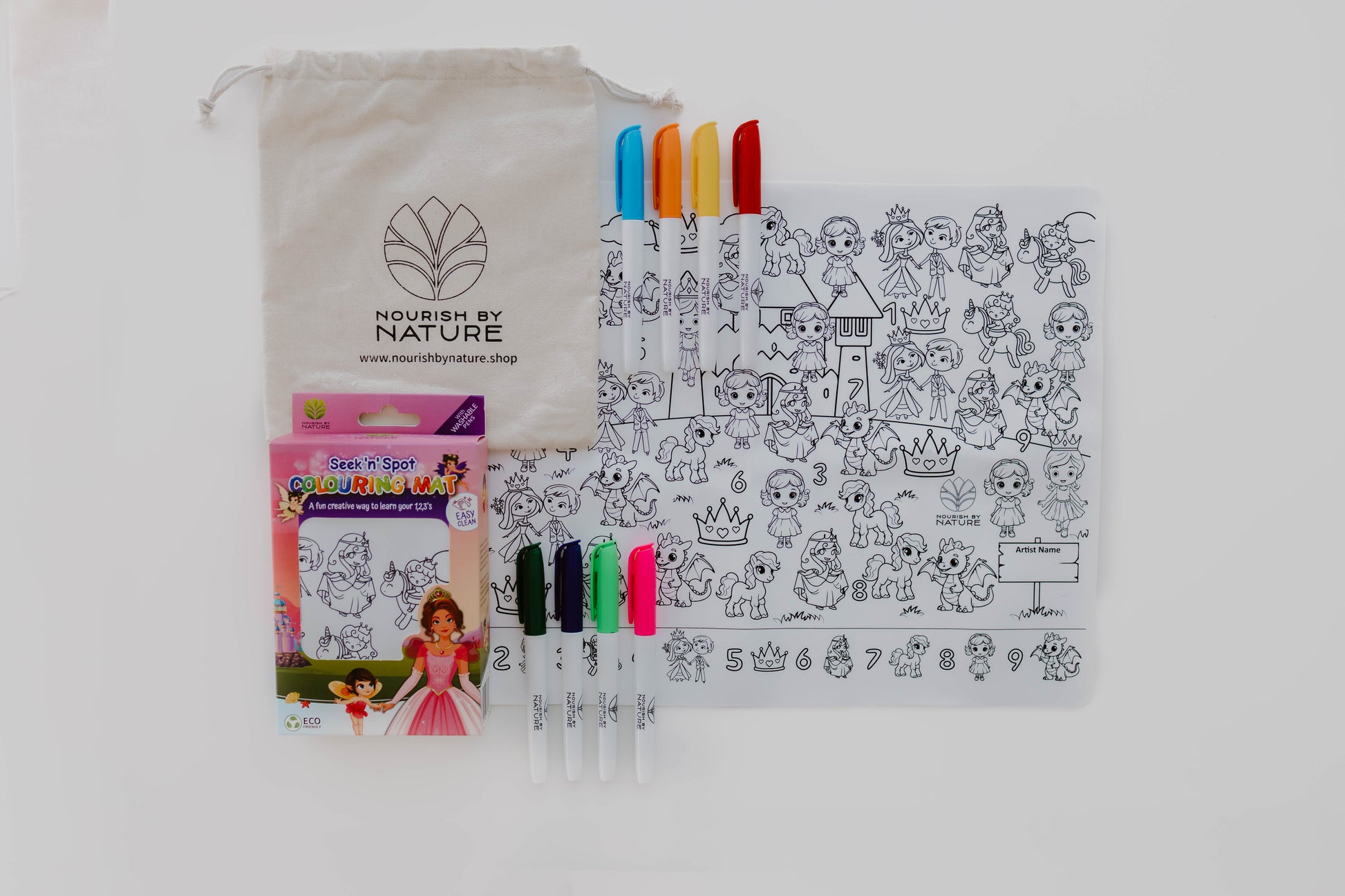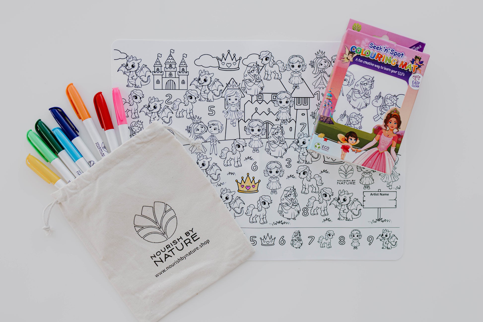 The Seek N Spot Silicone Colouring Mat by Nourish by Nature offers an exciting and eco-friendly activity that combines creativity with learning. Featuring a princess theme "seek and spot" design, children are challenged to find and count various characters hidden in the scene, making it a fun way to practice their counting skills while colouring. The box includes 8 washable markers.